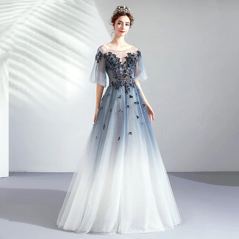 Ombre A Line Half Sleeves Tulle Round Neck Prom Dress OKQ75