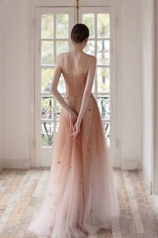 Ombre A Line Long Tulle Spaghetti Straps Prom Dress With Beads OKK60