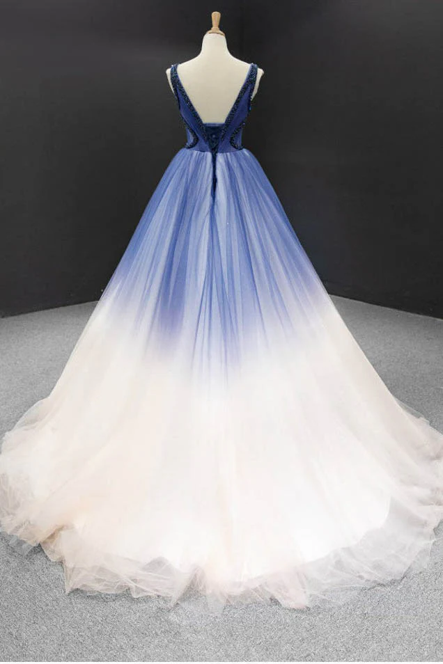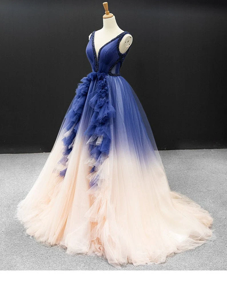 • Ombre A-line Pleated Ruffles Beach Boho Prom Gowns Beading Evening Dresses OKU99