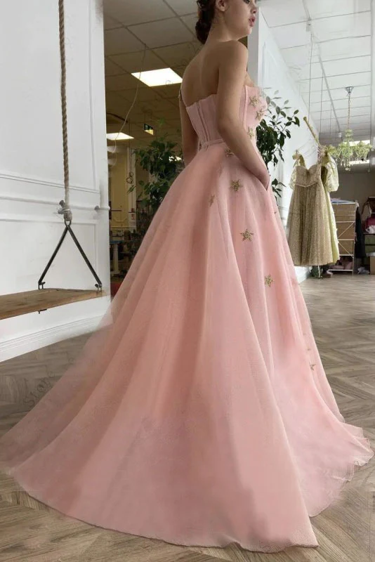 Pink A-line Prom Dress With Stars Princess Bustier Corset Evening Dress With Pocket OKV70