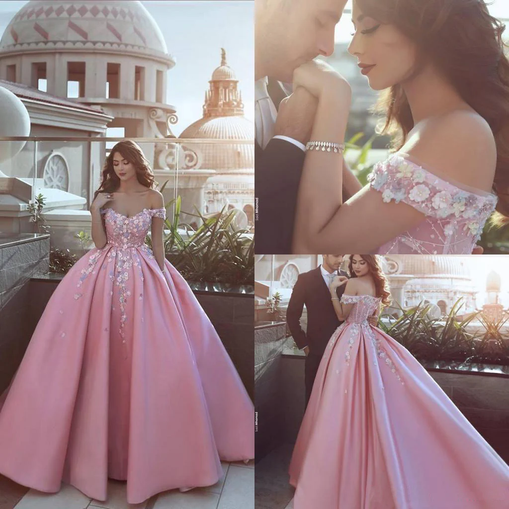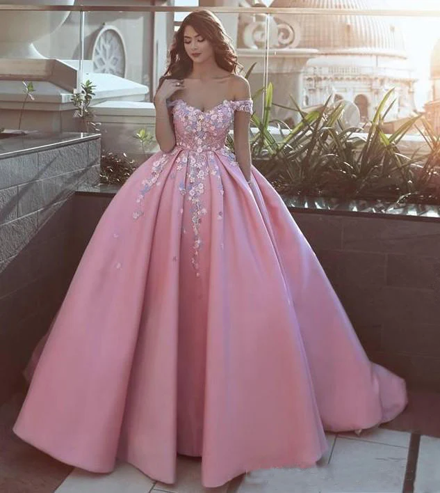 Pink Off the Shoulder Ball Gown Lace Appliques Satin Prom Dresses OK903
