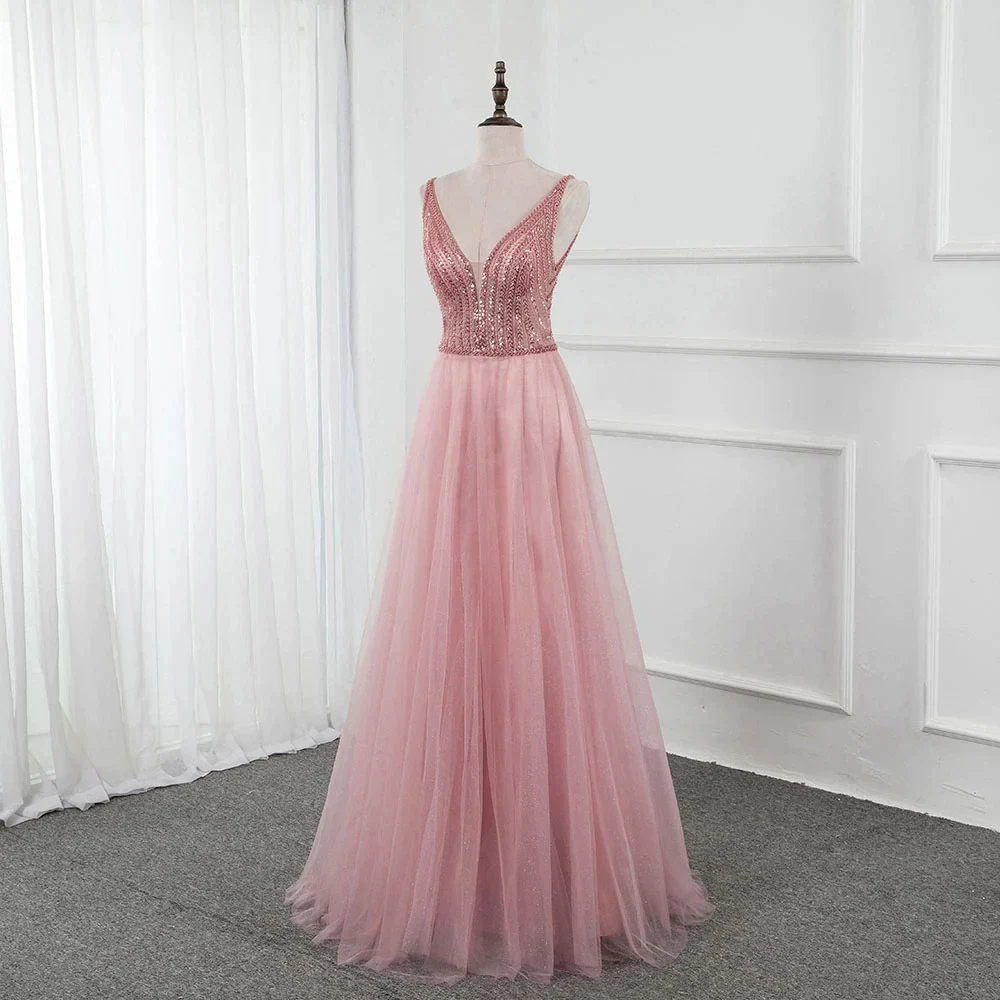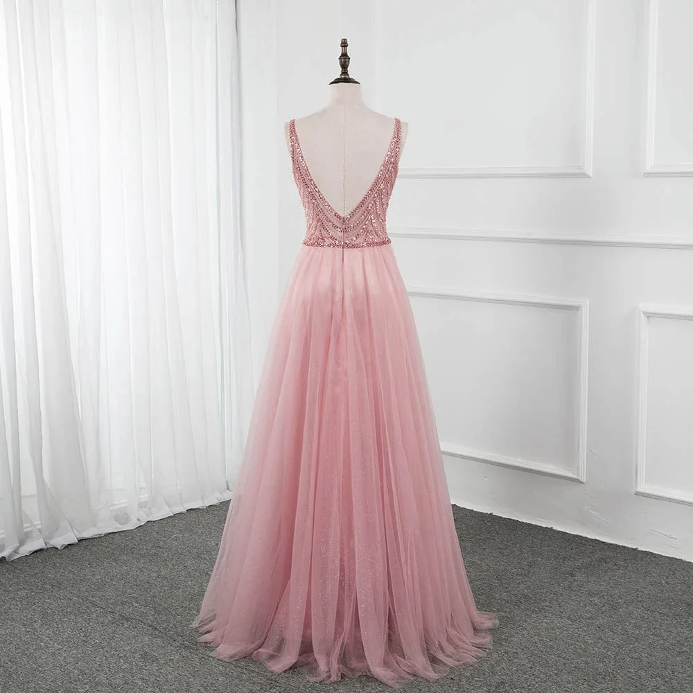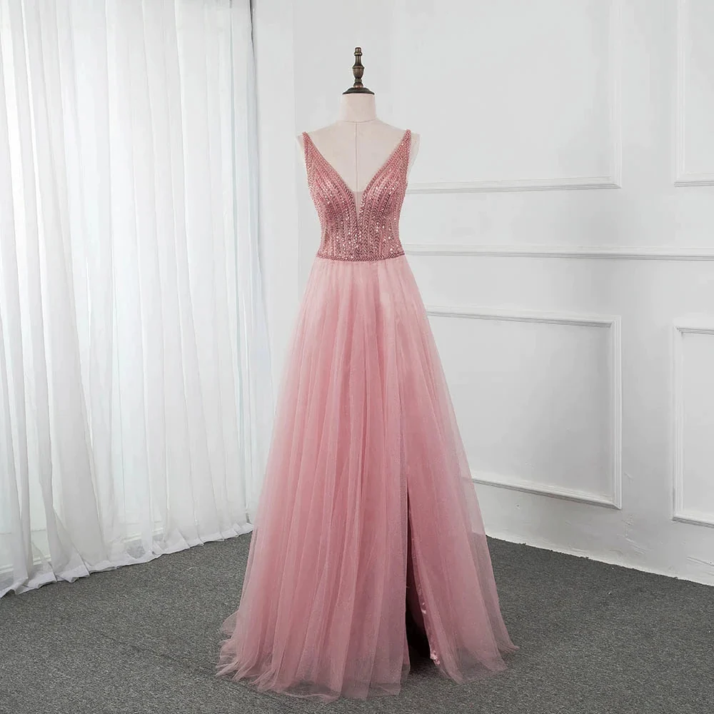• Pink Split Long Prom Dress Beading Sequined Tulle V Neck Sleeveless Party Gown OKW73