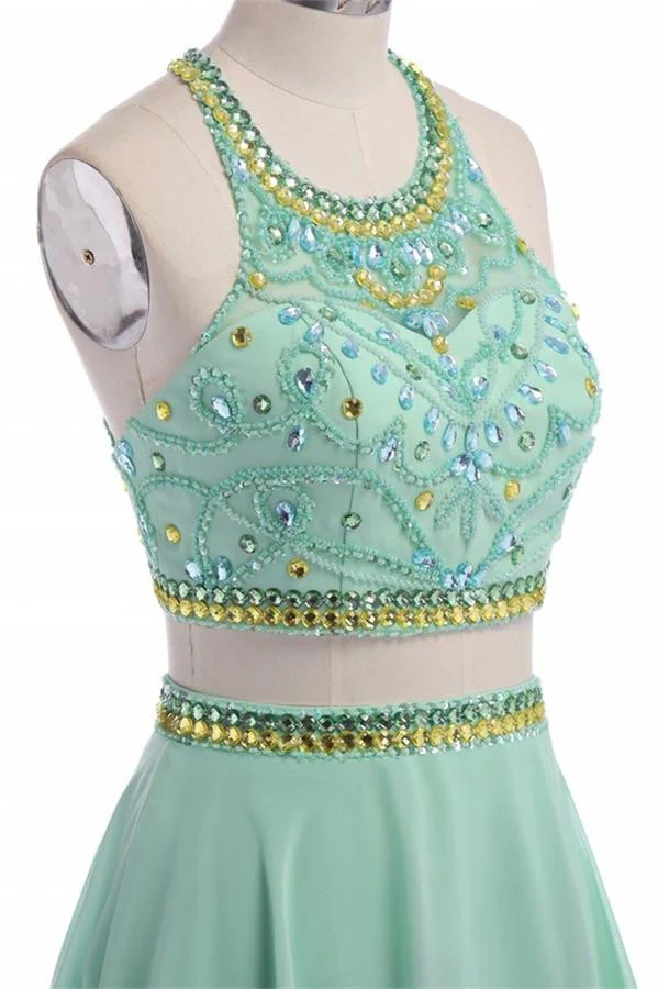 Pretty Mint Green Long Chiffon Beading Backless Prom Dress With Spaghetti K77
