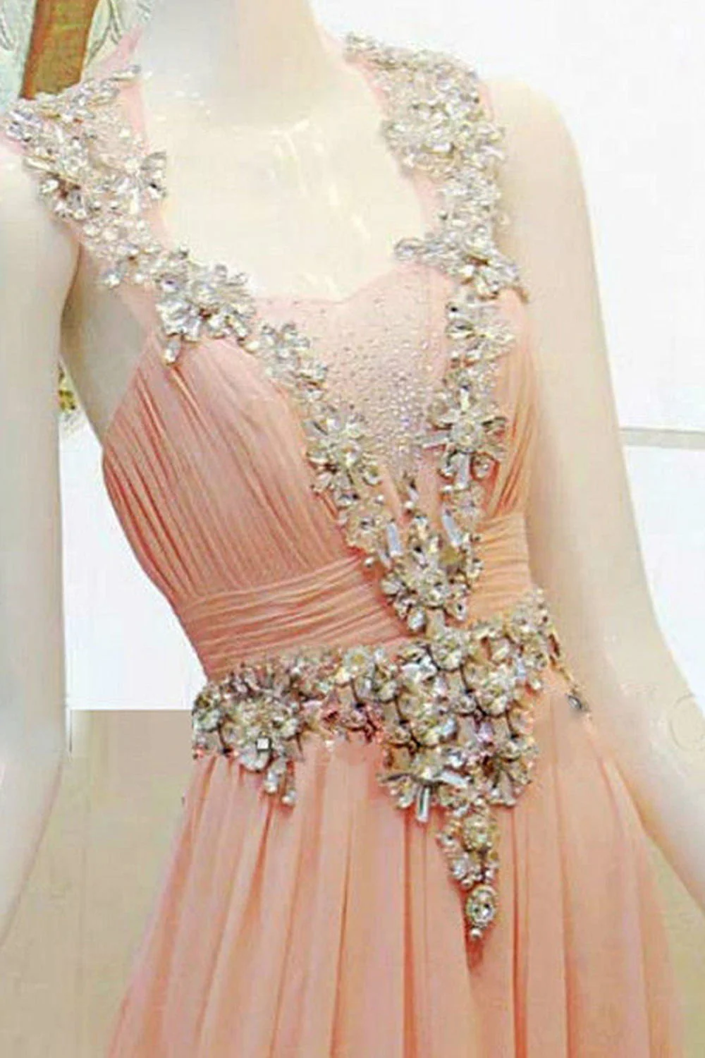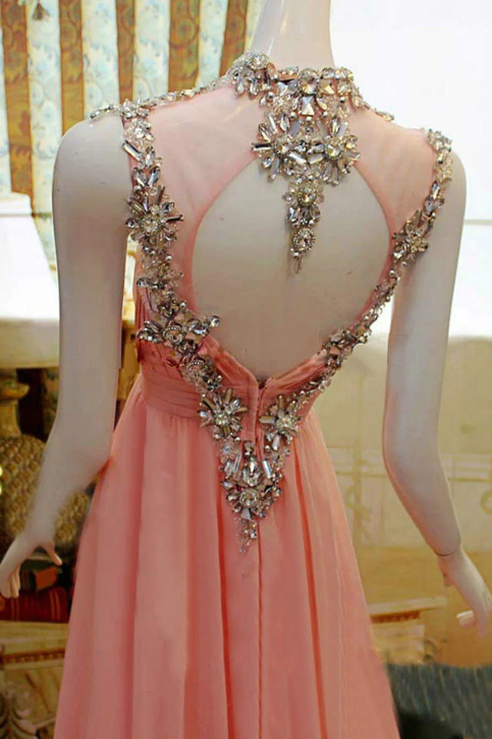 Pink High Low Backless Beading Long Chiffon Prom Dresses K89