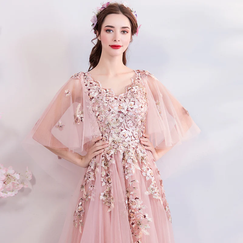 Princess A Line Pink Long Tulle Appliques V Neck Prom Dress OKG68