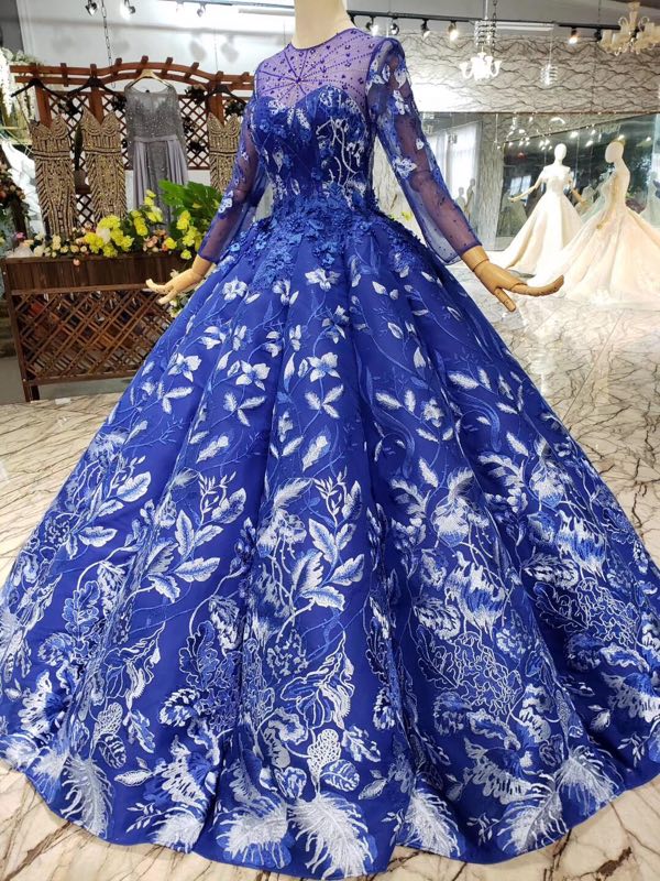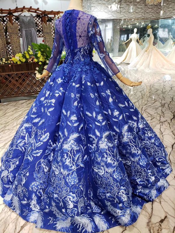 • Royal Blue Long Sleeves Lace Prom Dress,Ball Gown Quinceanera Dresses OKK6