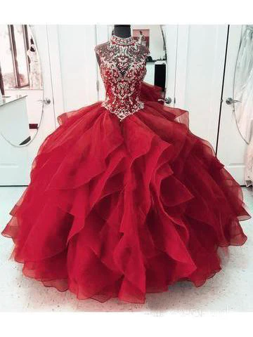Royal Blue Organza High Neck Quinceanera Dress Burgundy Beading Prom Dresses OKI22
