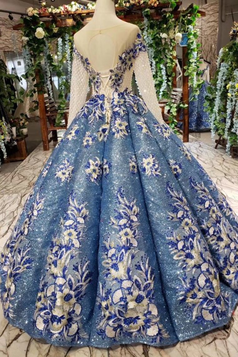 Scoop Long Sleeves Lace Up Back Blue Appliques Prom Dress OKL23