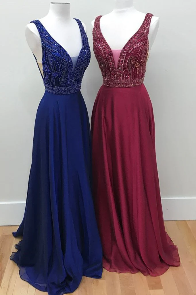 • Sexy Low Cut Beading Chiffon Long Prom Dress For Teens,Graduation Party Dresses OK939