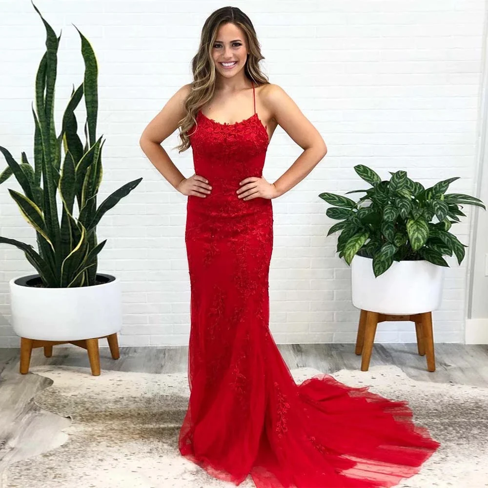 Sexy Red Long Mermaid Appliques Prom Dress Spaghetti Straps Tulle Evening Gown OKW70