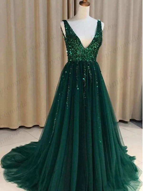 • Sexy V-nevk V-back Green Tulle Evening Dresses,Cheap Long A Line Prom Dress OKI54