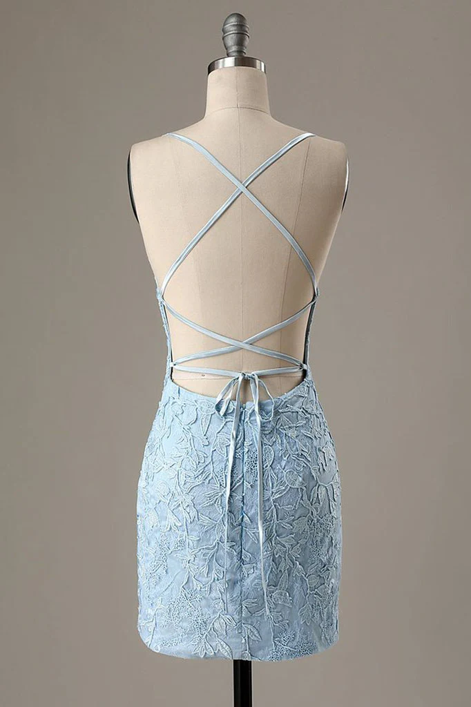 • Short Light Blue Sheath Lace Prom Dresses, Tight Graduation Homecoming Dress OKX52