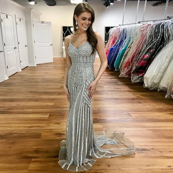 Silver Beaded Long Spaghetti Strap Mermaid Prom Dress OKE56