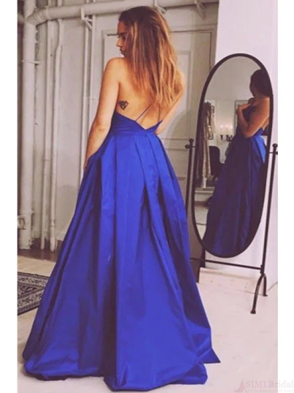 Simple Royal Blue V-neck Cheap Open Back A-line Prom Dress K696
