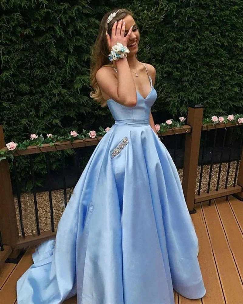 Sky Blue Cross Back Prom Dress Long Elegant V-neck Evening Dress OKW32