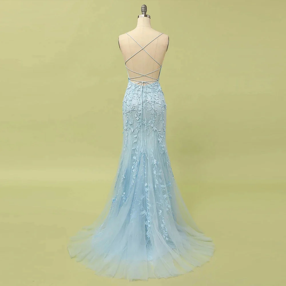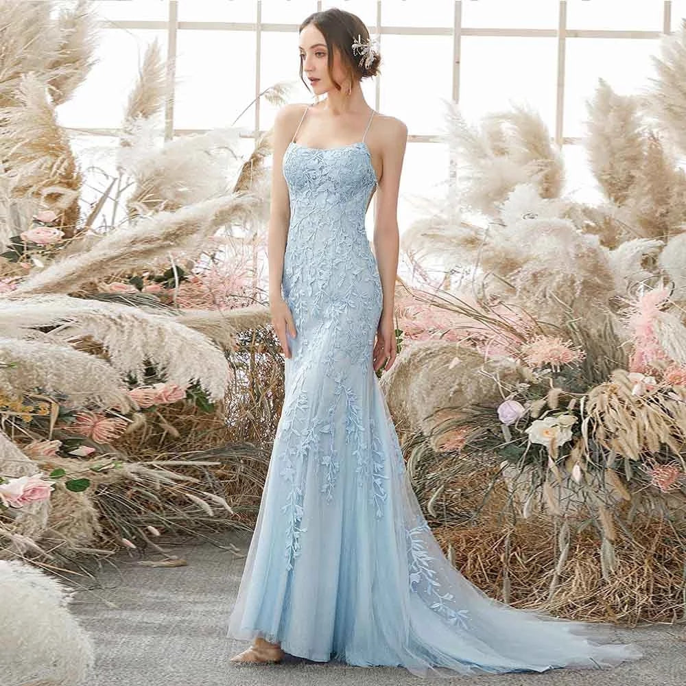 • Sky Blue Long Mermaid Lace Appliques Prom Dress With Rhinestones OKW66