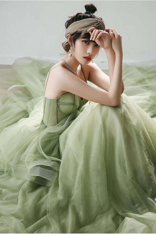 • Spaghetti Straps Mint Green Ball Gown Formal Prom Gowns A Line Tulle Evening Dresses OK1447
