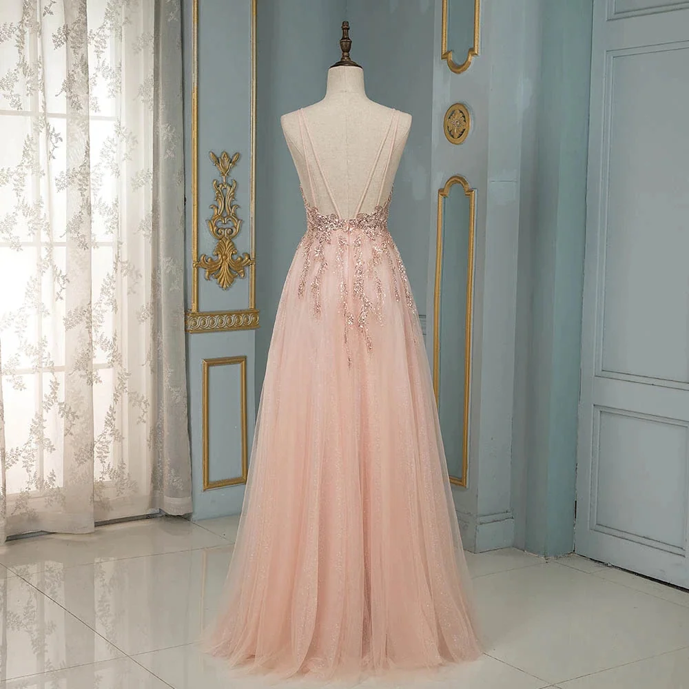 • Sparkly Pink Beading Long Prom Dress Spaghetti Straps Tulle Sequined Party Gown OKW71
