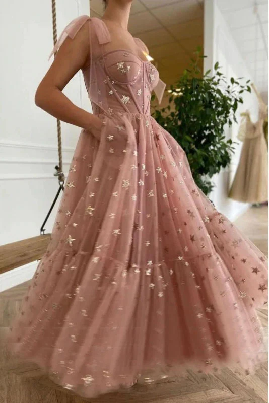 Sparkly Stars Tulle Blush Pink Prom Dress Shiny Princess Evening Dress With Straps OKV59