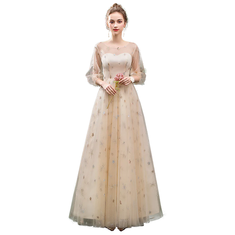 • Stunning A Line 3/4 Sleeves Tulle Round Neck Prom Dress Evening Dress OKQ76