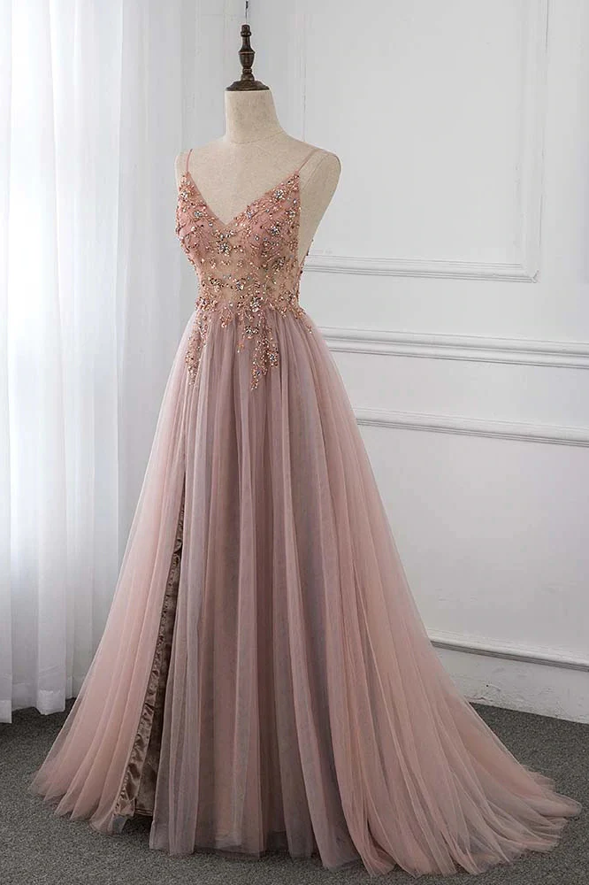 Sweet Dusty Pink Crystal Prom Dress Long Straps Spaghetti Tulle Evening Gown OKV96