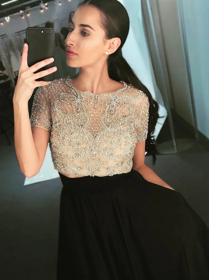 • Two Piece Crew Short Sleeves Floor-Length Black Prom Dresses with Beading OKL89