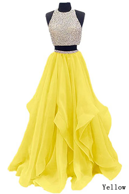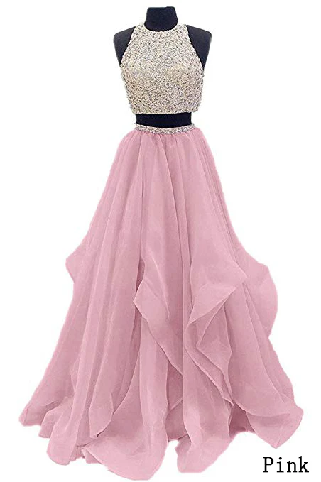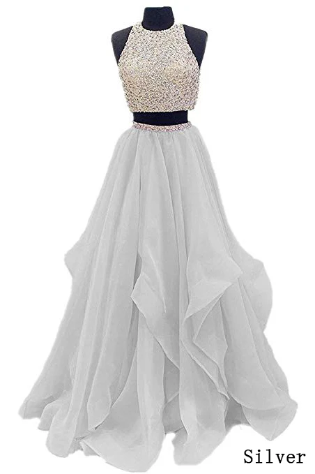Two Piece Floor Length Burgundy Prom Dresses Beaded Open Back Evening Gown OK603