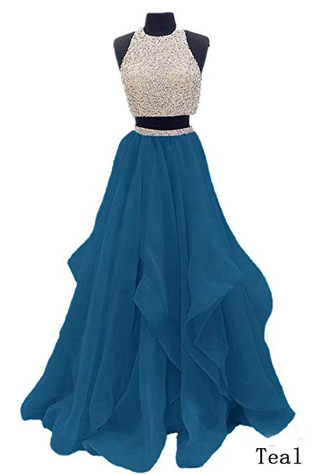 • Two Piece Floor Length Burgundy Prom Dresses Beaded Open Back Evening Gown OK603