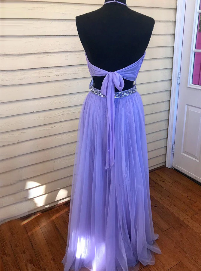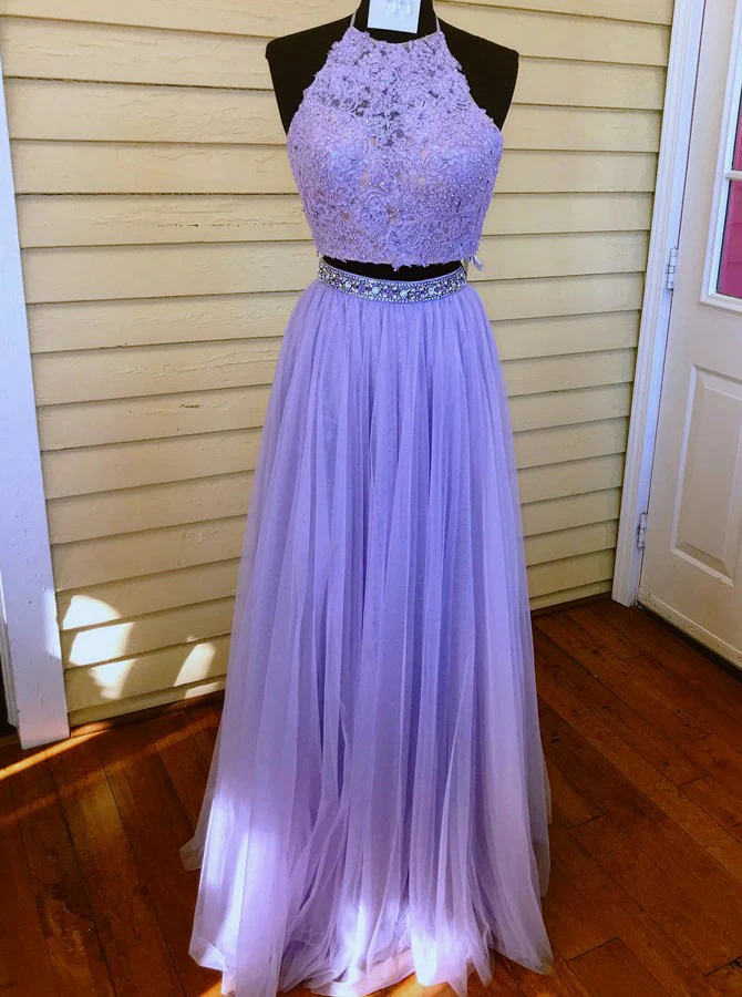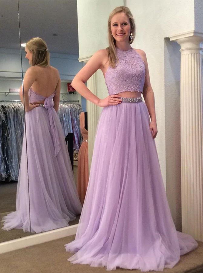 • Two Piece Halter Backless Tulle Lavender Prom Dresses with Lace Beading OKI75
