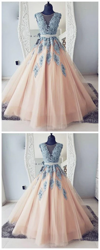 • V-neck Blue Lace Ball Gown Long Tulle Evening Dresses,Cheap Prom Dresses OKG36
