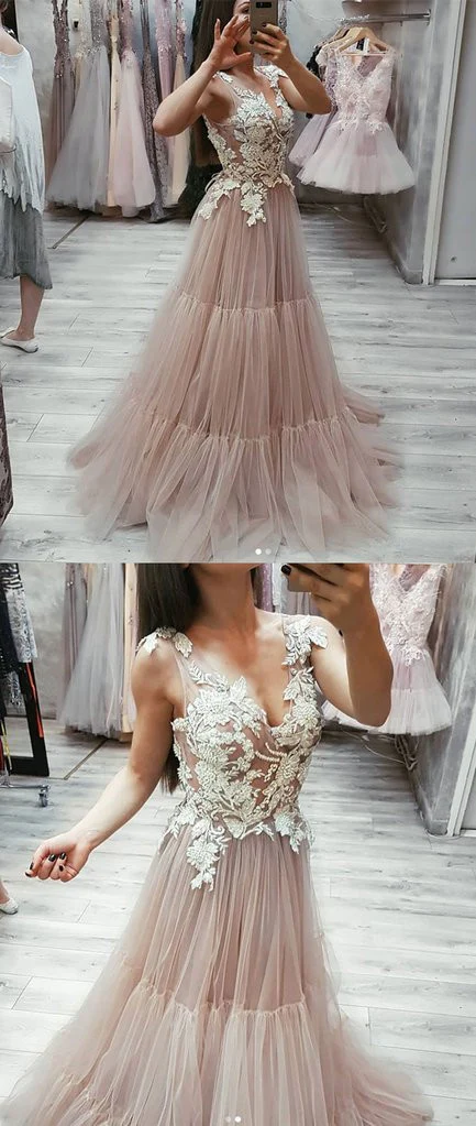 • V Neck Tulle Lace Appliques Long Prom Dress, Cheap Tulle Evening Dress OKG21