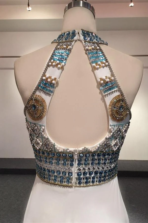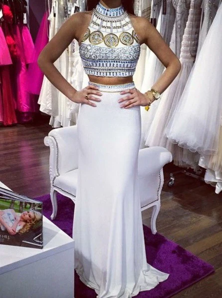 White Halter Beaded Two Pieces Long Mermaid Prom Dress K714