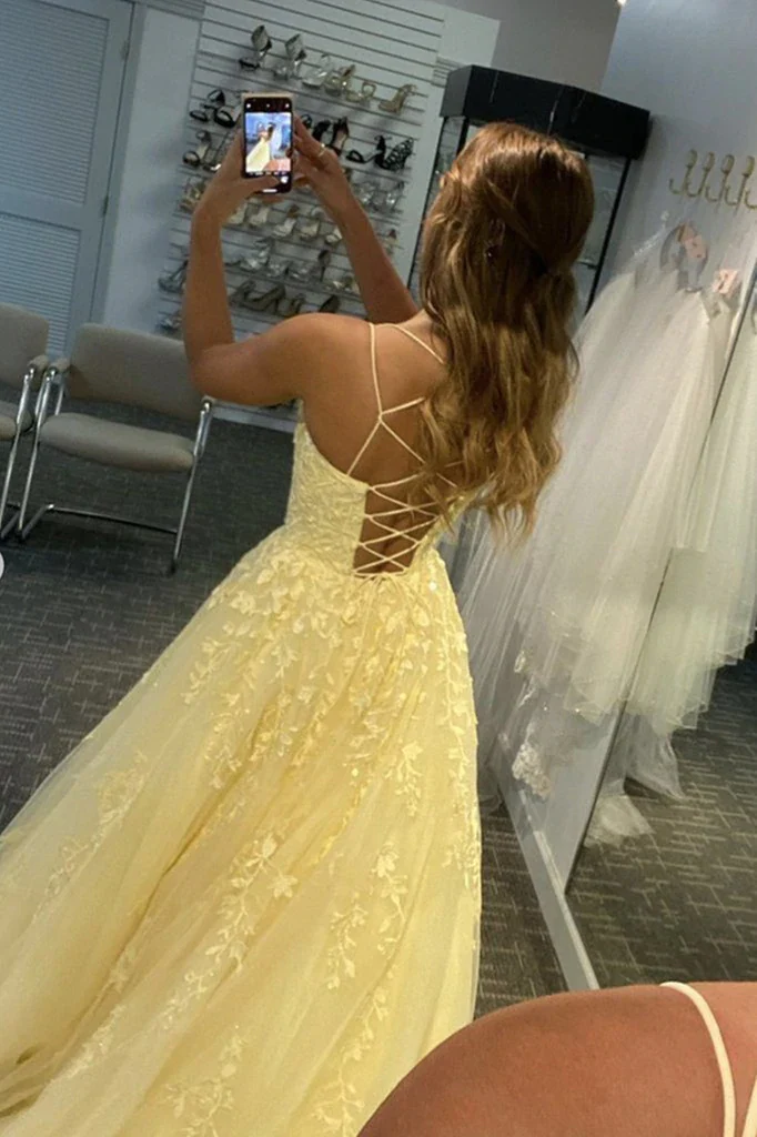 • Yellow Lace Appliques Aline Tulle Long Prom Dress Formal Evening Dress OK1416