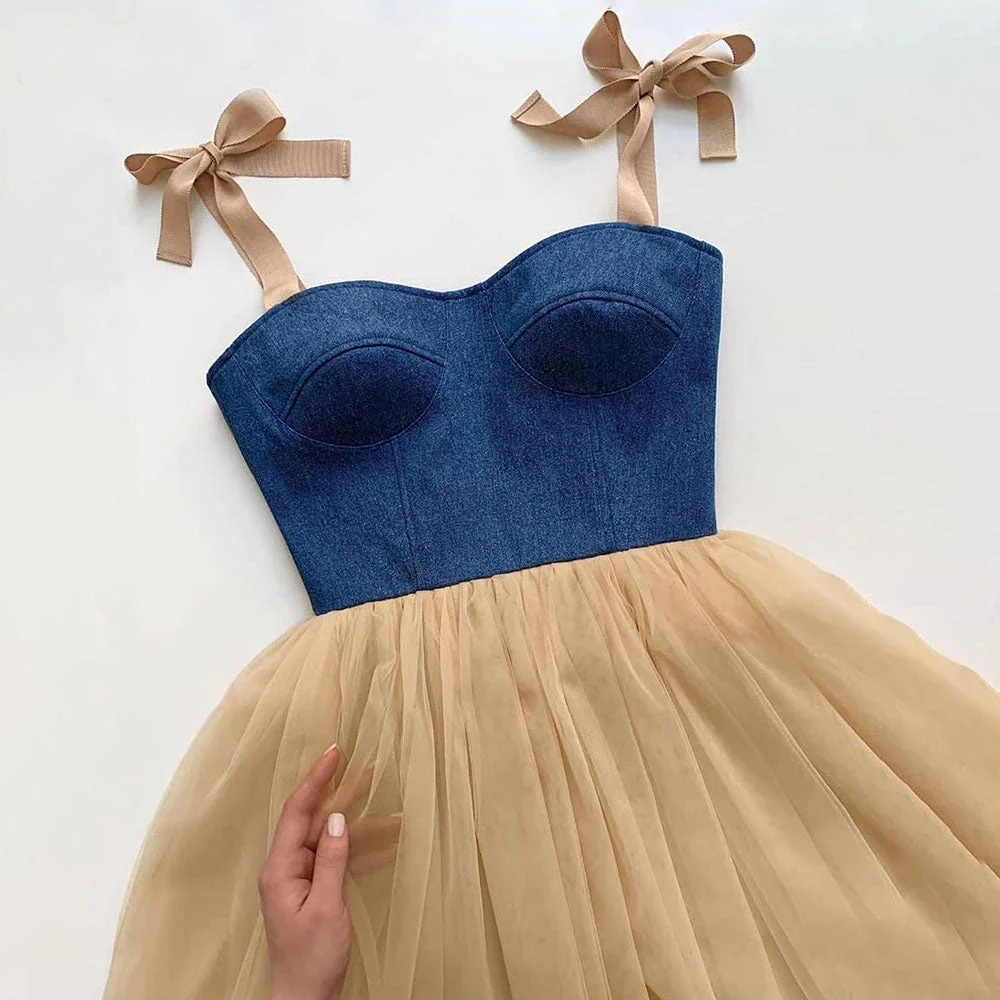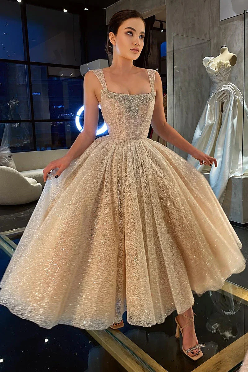 Chic Strapless Spaghetti Straps Prom Dress Tulle Tea Length Evening Dress OKW46