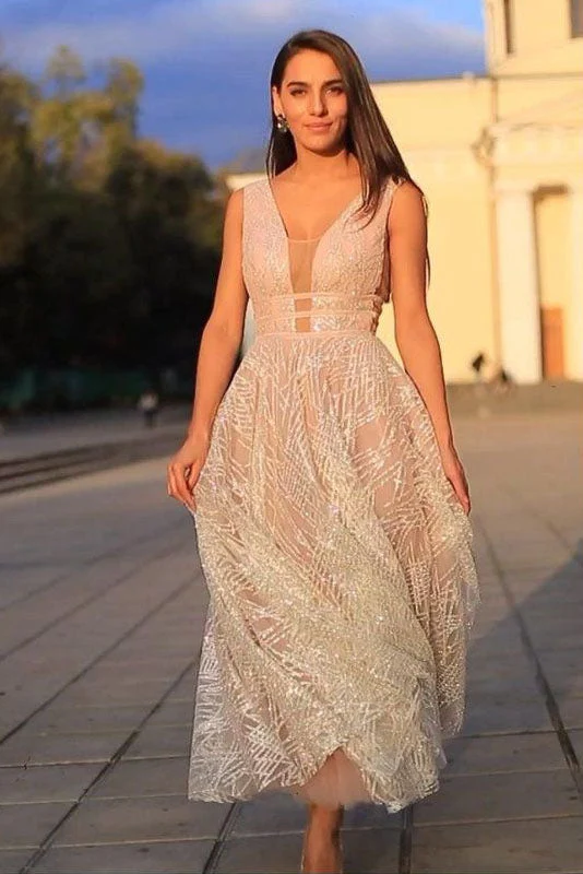 Sparkly Sequins V Neck A Line Long Prom Dress Formal Evening Dress OK1297