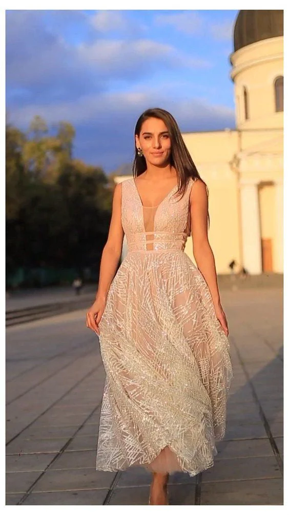 A Line Lace V Neck Long Prom Dress Sleeveless Formal Evening Dress OK1604