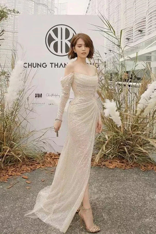 Long Sleeves Sequins Side Slit Long Prom Dress Shiny Evening Party Dress OK1640
