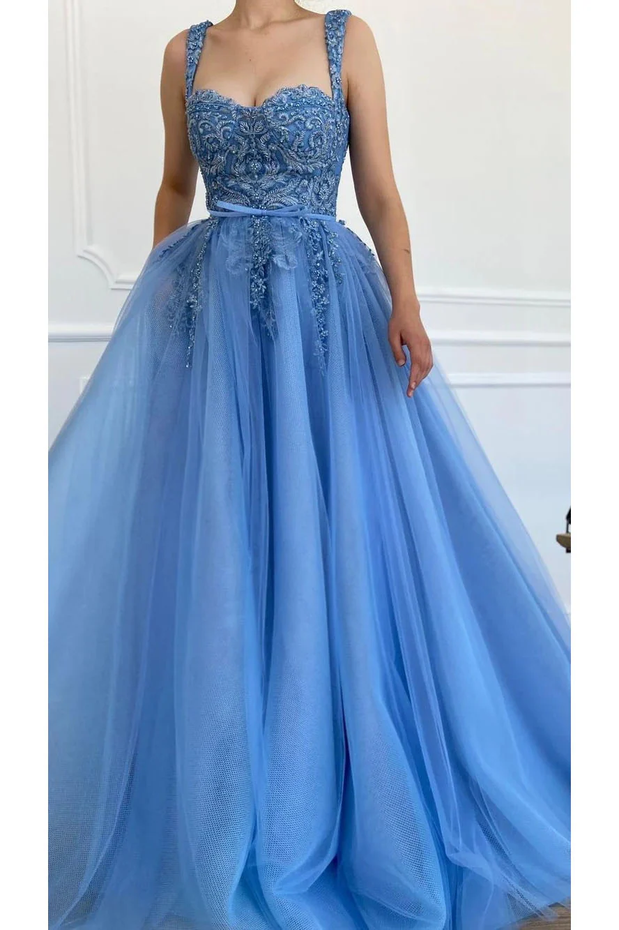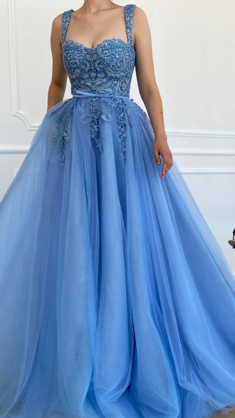 New Formal A-line Spaghetti Straps Lace Appliqued Long Blue Prom Dress OKT5