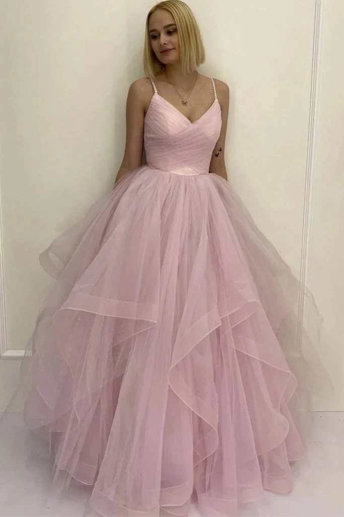 Light Pink Spaghetti Straps Tulle Puffy Prom Gown, Asymmetrical Formal Evening Dress OK1670