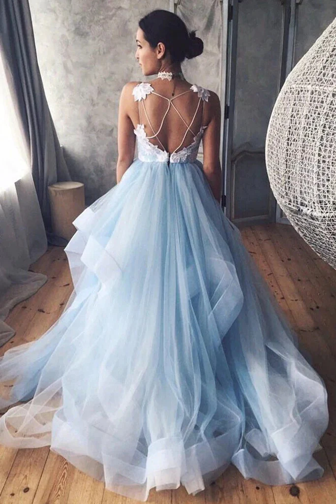 A Line V Neck Light Blue Long Prom Dresses with Lace Appliques, Formal Evening Dresses OK1666