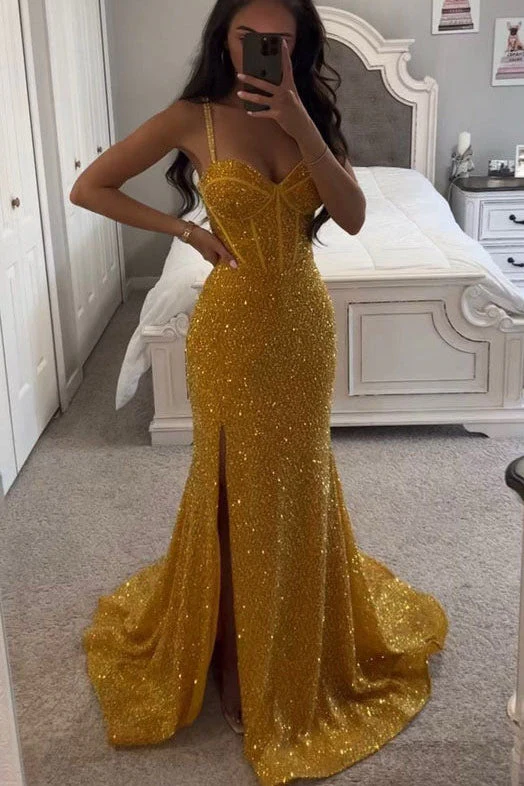 Yellow Sequined Mermaid Spaghetti Straps Long Prom Dress Formal Evening Dress OK1608