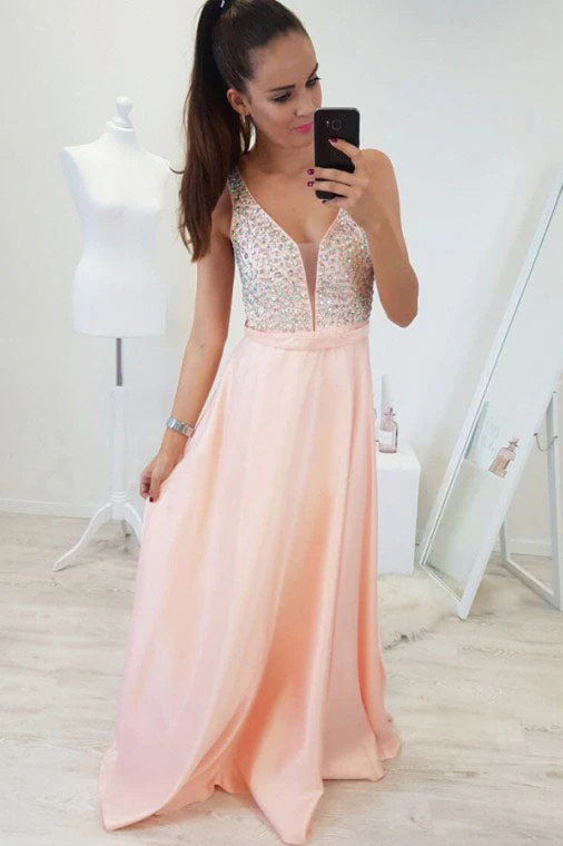 A-line V-Neck Floor-Length Pearl Pink Prom Dress with Beading OKR6