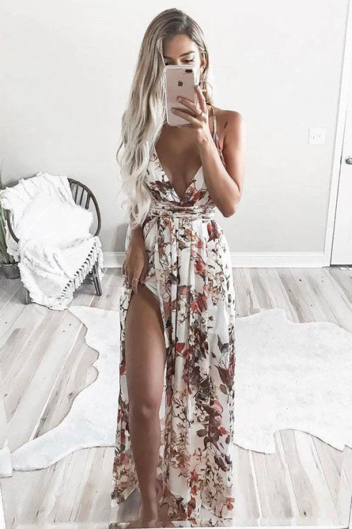 A-line Deep V-Neck Printed Chiffon Prom Dress with Split OKR2