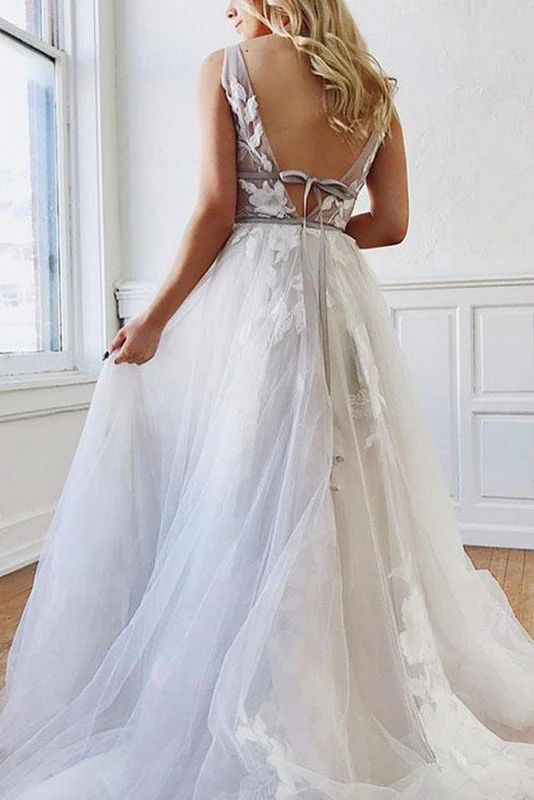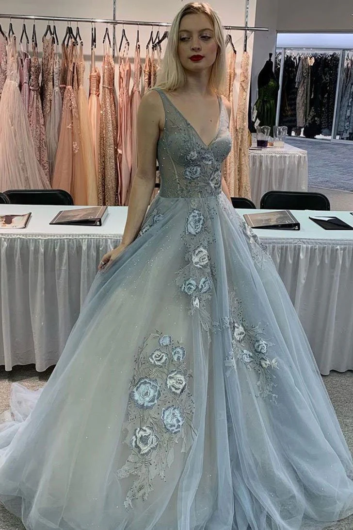 Gray V Neck Tulle Lace Appliques Long Prom Dresses Formal Evening Dress OKQ46