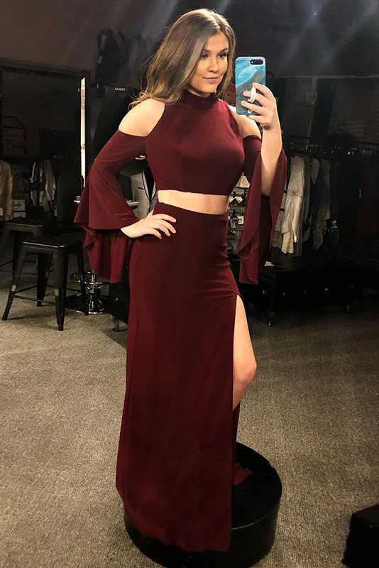 Two Piece Mermaid Cold Shoulder Long Sleeves Burgundy Prom Dresses With Split OKQ54