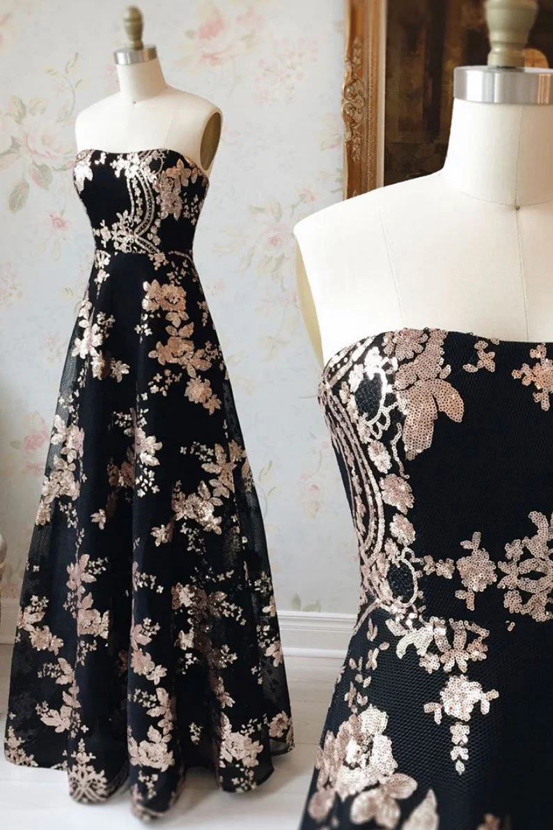 A Line Strapless Black Sequin Long Prom Dresses Charming Evening Dress OKQ48