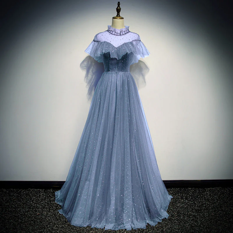 A Line High Neck Tulle Short Sleeves Prom Dress Long Evening Party Dress OKQ73
