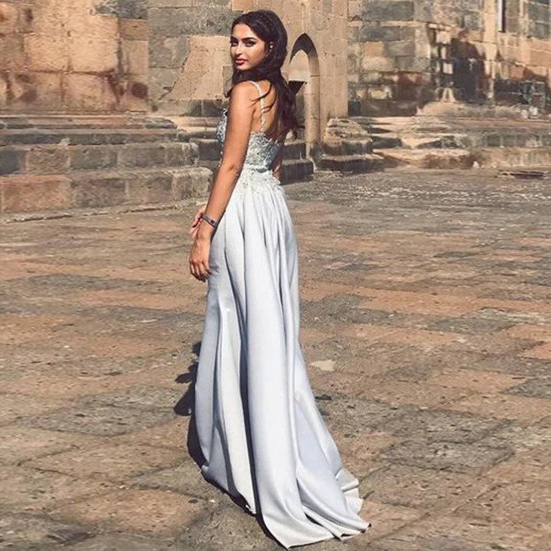 Mermaid Spaghetti Straps Detachable Silver Prom Evening Dresses with Appliques OKQ66