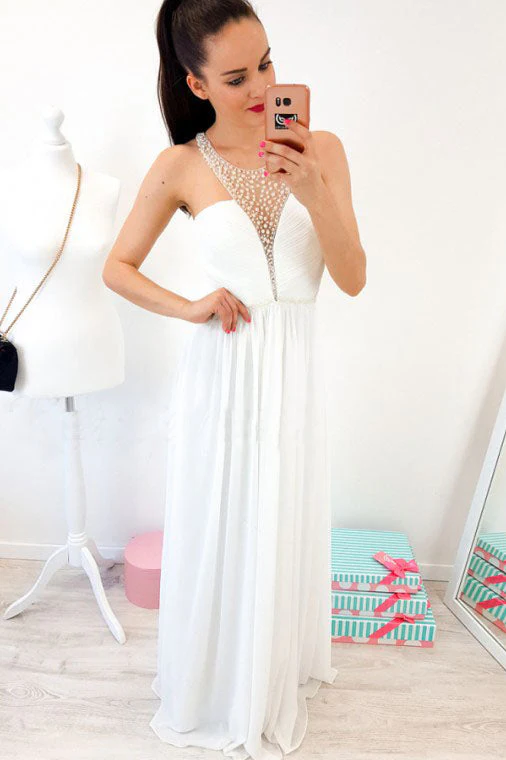 A-line Crew Floor-Length White Chiffon Prom Dress with Pearls OKR5
