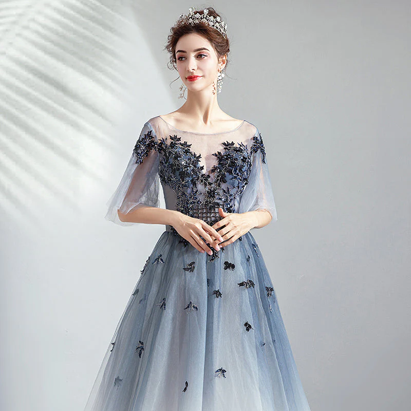 Gray A Line Round Neck Appliques Tulle Long Prom Dresses Evening Dress OKQ52